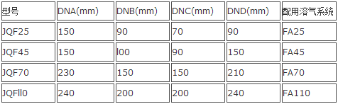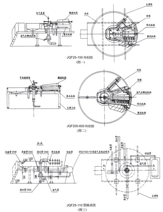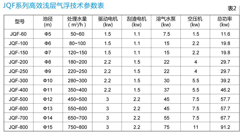 注:1、表中處理水量依據,回流比R=30%,水力表面負荷:q=6-8m3/m2.h。3、JQF25-JQF200,為鋼制池體,其工作荷載指整機正常工作時,土建地基承受的總負荷。